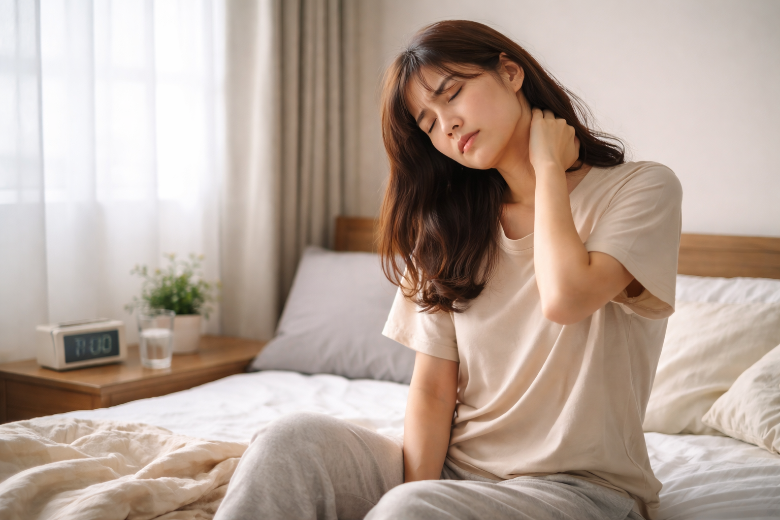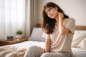 長時間同じ姿勢で眠ることで、筋肉がこわばり血流が滞りやすくなります。特に首や肩、背中の緊張が強い方は、朝起きたときに身体が重く感じやすい傾向があります。